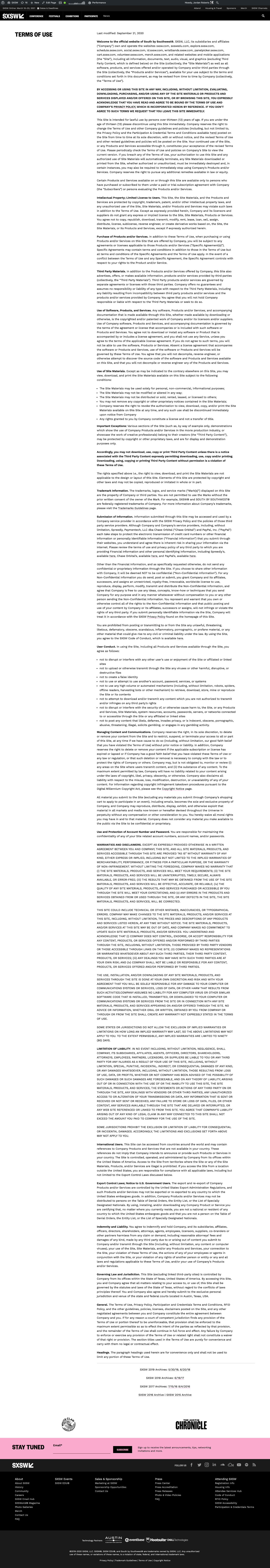Welcome! SXSW, LLC, its subsidiaries and affiliates (collectively, “Company”) own and operate the websites sxsw.com, sxswedu.com, explore.sxsw.com, schedule.sxsw.com, social.sxsw.com, id.sxsw.com, wristbands.sxsw.com, panelpicker.sxsw.com, cart.sxsw.com, volunteer.sxsw.com, merch.sxsw.com, my.sxsw.com,my.sxswedu.com, and related websites and mobile applications (collectively, the “Properties” and, each, a “Property”), including all information, documents, text, audio, visual, and graphics (excluding Third Party Content, which is defined below) on the Properties (collectively, the “Materials”) as well as owns or operates under license all software, products, and services offered and/or operated by Company and/or third parties through the Properties (collectively, the “Products and/or Services”), available for your use subject to the terms and conditions set forth in this document, or in force at the time of your use (collectively, the “Terms of Use”).